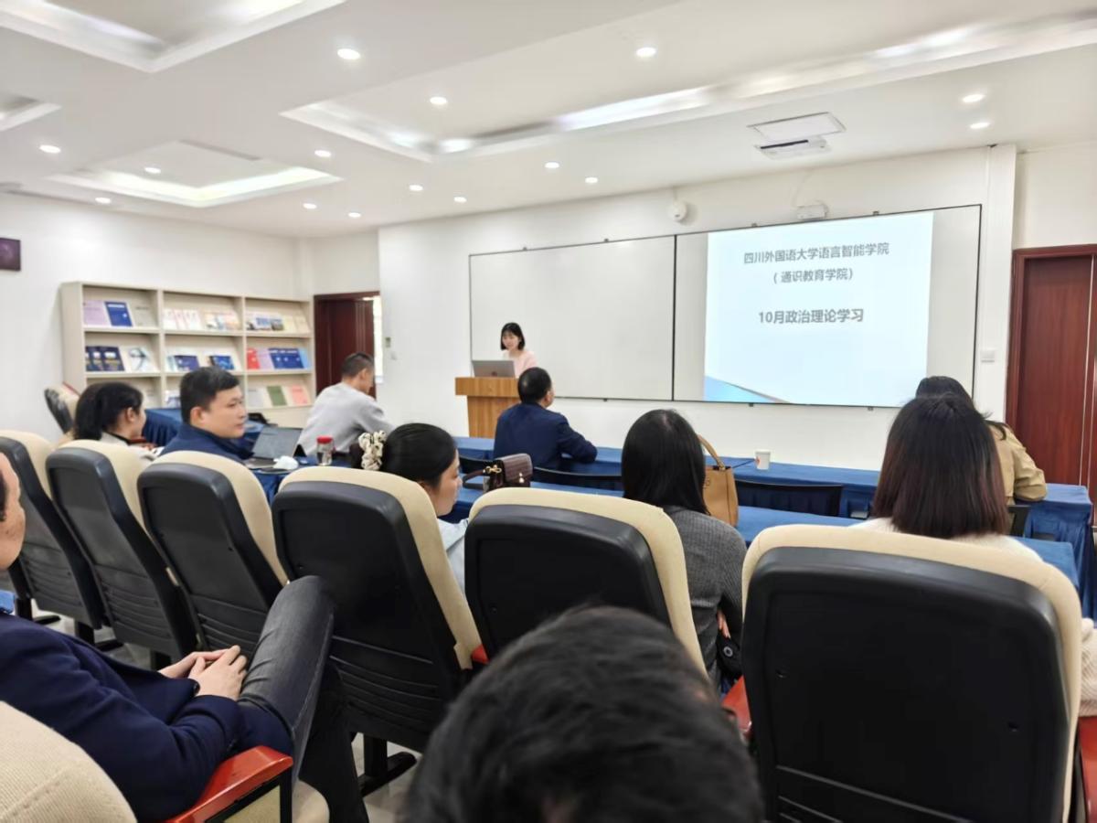 20251024日上午和下午,四川外国语大学语言智能学院(通识教育学院)在博文楼4-1会议室分别结合学科建设和课程建设开展10月份全体教职工政治学习。本次学习活动由党总支书记向蓉主持,陈秋桐老师和王甍老师领学,全体教职工参与。