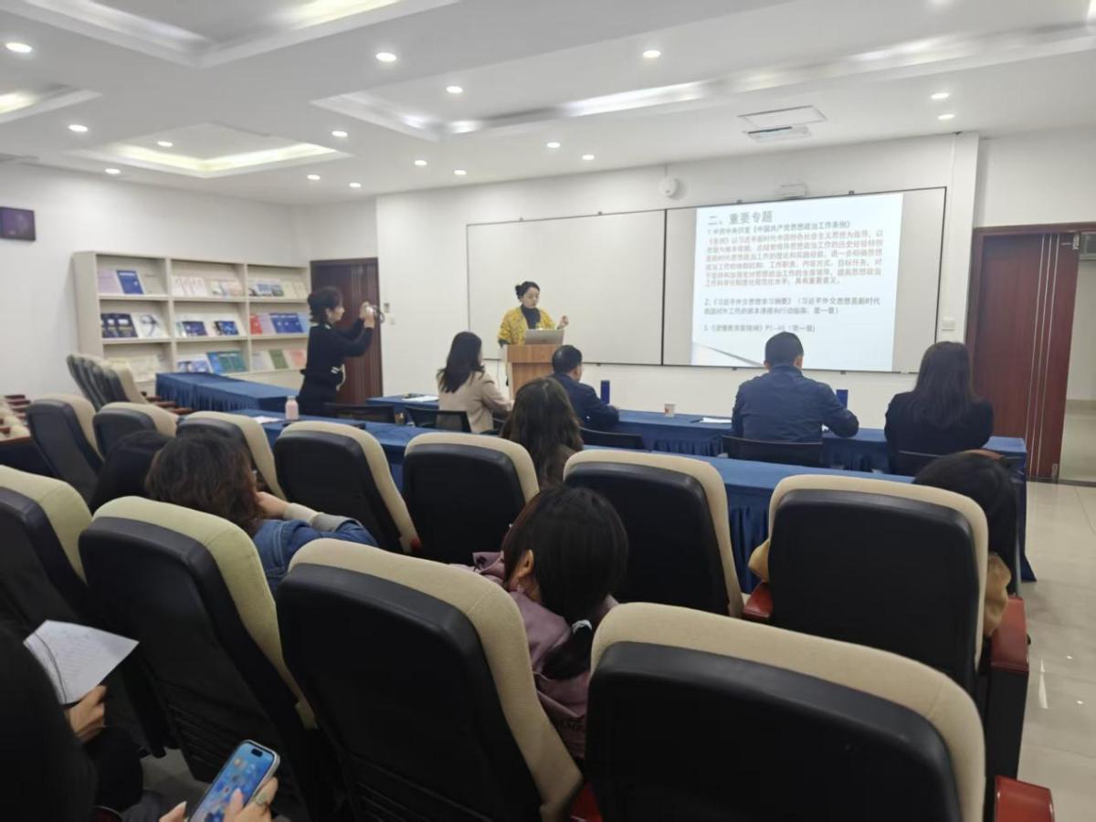 陈秋桐老师和王甍老师传达了中共中央最新印发的《中国共产党思想政治工作条例》,学习了《习近平外交思想学习纲要》第一章、《读懂教育家精神》第一章,以及中共中央政治局讨论拟提请党的二十届四中全会审议文件的相关精神。通过学习,大家进一步明确了立德树人、思想政治工作、外交话语体系建设的顶层设计和实践指向。