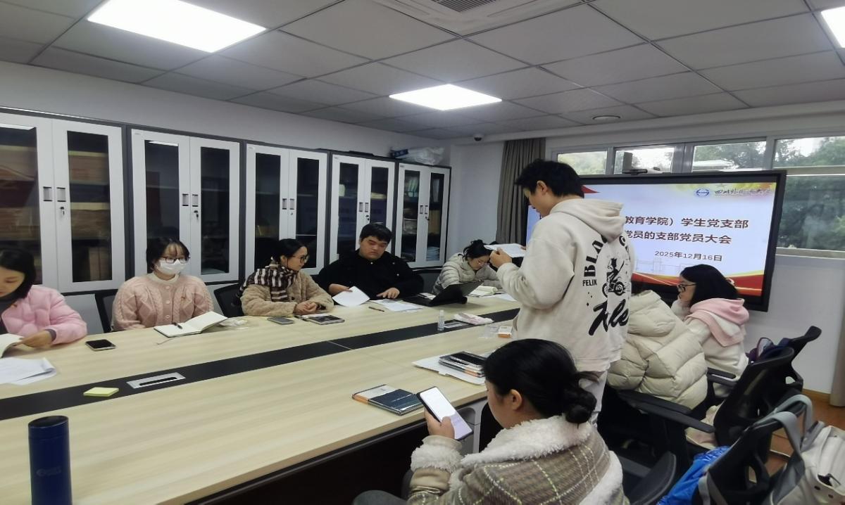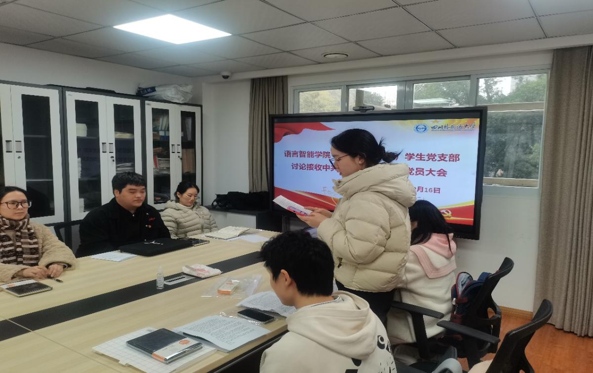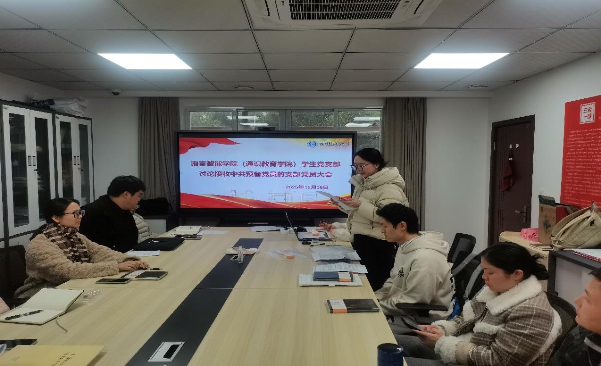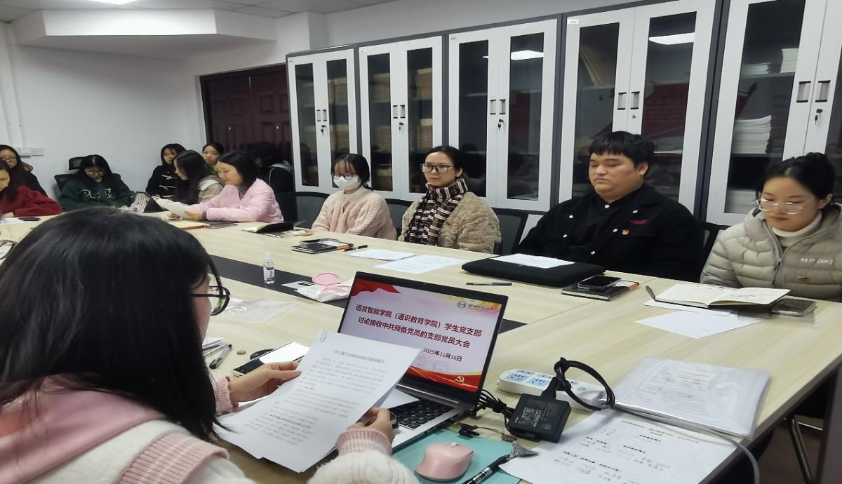 为深入贯彻落实学校党委关于党员发展工作的部署要求,切实加强基层党组织建设,语言智能学院(通识教育学院)学生党支部于2025年12月16日中午12:00,在学院207会议室召开党支部党员大会,讨论接收尚晓童同志、廖宇洁同志为中共预备党员的相关事宜。支部正式党员、预备党员、发展对象、入党积极分子及入党申请人均按时到场,会议庄重有序,氛围热烈。