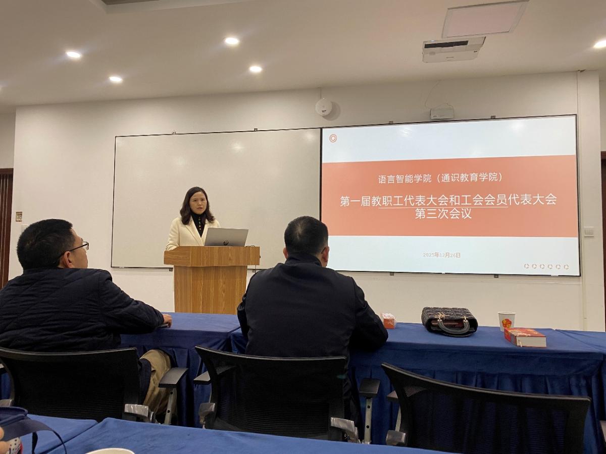 四川外国语大学语言智能学院(通识教育学院)于2025年12月26日在博文楼4楼会议室成功召开了第一届教师代表大会暨工会代表大会第三次会议。本次会议由学院党总支书记向蓉主持,旨在深入贯彻《四川外国语大学教职工代表大会实施办法》和《四川外国语大学工会会员代表大会实施办法》,聚焦“总结2025、谋划2026”主线,圆满完成各项议程。