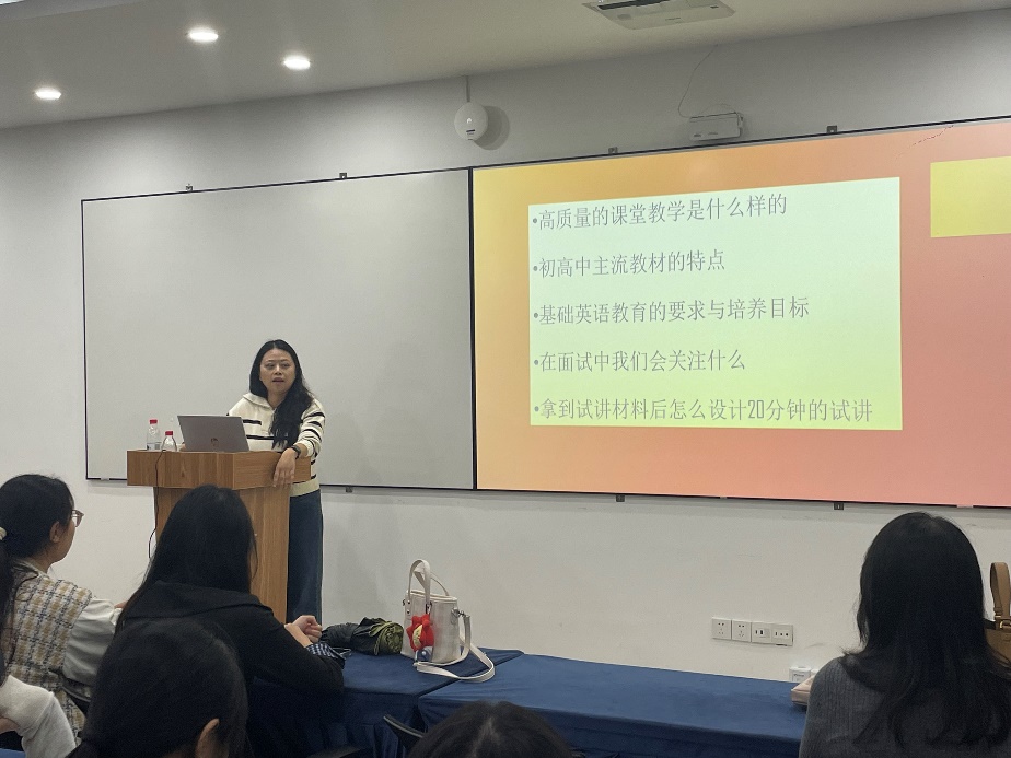 2025113日晚19:00,语言智能学院(通识教育学院)特邀成都市实验外国语学校英语高级教师高彬老师,在博文楼401举办了“教师应聘试讲”专题讲座。讲座由学院党总支书记向蓉主持,语言智能学院(通识教育学院)全体研究生及国际教育学院部分同学共同参与。