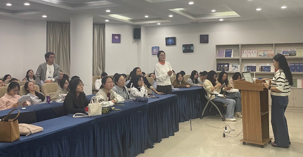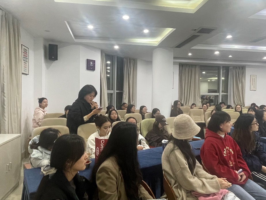 在讲座的互动交流环节,同学们提问踊跃,问题不仅涉及教学方法,更延伸至教师职业发展的现实层面。除如何平衡工作与休息、实习机会获取、个性化学生指导等问题外,多位同学关注到教师岗位的薪资待遇、职业发展路径等求职实际议题。高彬老师结合自身经验一一作出回应,她强调了教师专业成长与职业规划的紧密关联,并指出在关注待遇的同时,更应重视教学能力的积累与课堂成就感的获得,鼓励大家树立长远发展的职业观念。