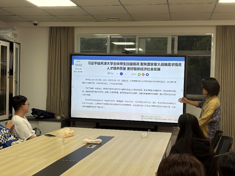 班会伊始,在“思想引领”板块中,同学们深入学习了习近平新时代中国特色社会主义思想的核心要义,重点围绕“十个明确”“十四个坚持”等重要内容展开讨论。主持人结合当前国家发展大局与青年使命,引导同学们深刻理解新时代奋斗主题,鼓励大家将“个人梦”自觉融入“中国梦”,在学术科研与社会实践中锤炼本领、担当重任。现场学习气氛浓厚,同学们纷纷表示,要以科学理论武装头脑,筑牢信仰之基,补足精神之钙。